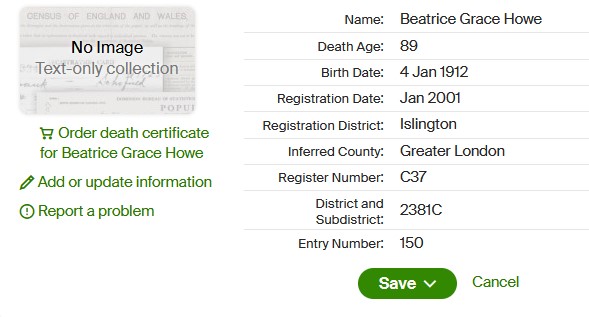 In The 1939 Register [998] we see Beatrice as a shop assistant, and single, age 27 although if you look closely you will see someone has later annotated the entry to show the name How. This likely relates to when Beatrice later married Herbert How.
