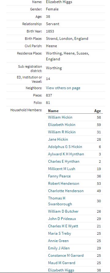 1861 Census, Adelaide is 6 [793], as a housemaid at 27 in 1881 [912, 912a], a cook at the Burlington Hotel, Worthing in 1891 [913, 913a]