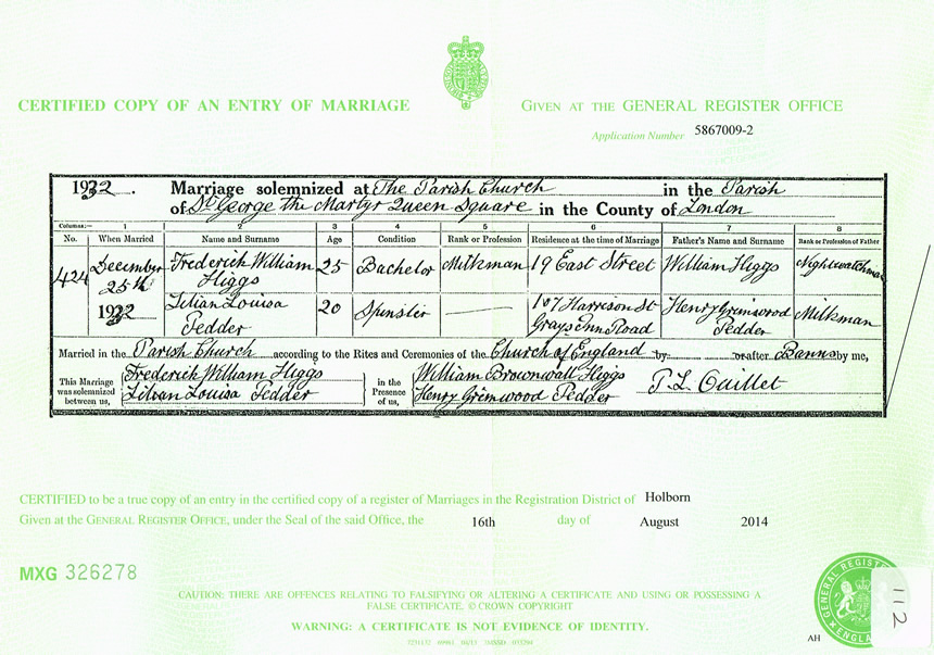 In 1932 at age 25 he married Lilian Louise Pedder. She lived not too far away in Harrison Street, just off Grays Inn Road. It was in Harrison street where Fred's sister Annie lived. This was likely to be the Annie that married Charles Walker and whose daughter I met in 2014.