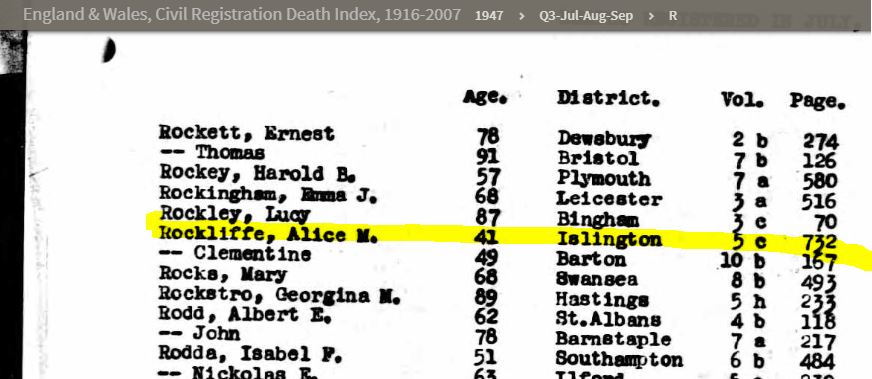 Alice died of cancer at the age of 41 on July 14th 1947. She was laid to rest in Islington Cemetery, East Finchley. The above inscription reads "In Loving Memory of My Dear Wife Alice Mary Rockliffe who passed away 14th July 1947 Aged 41 Years"