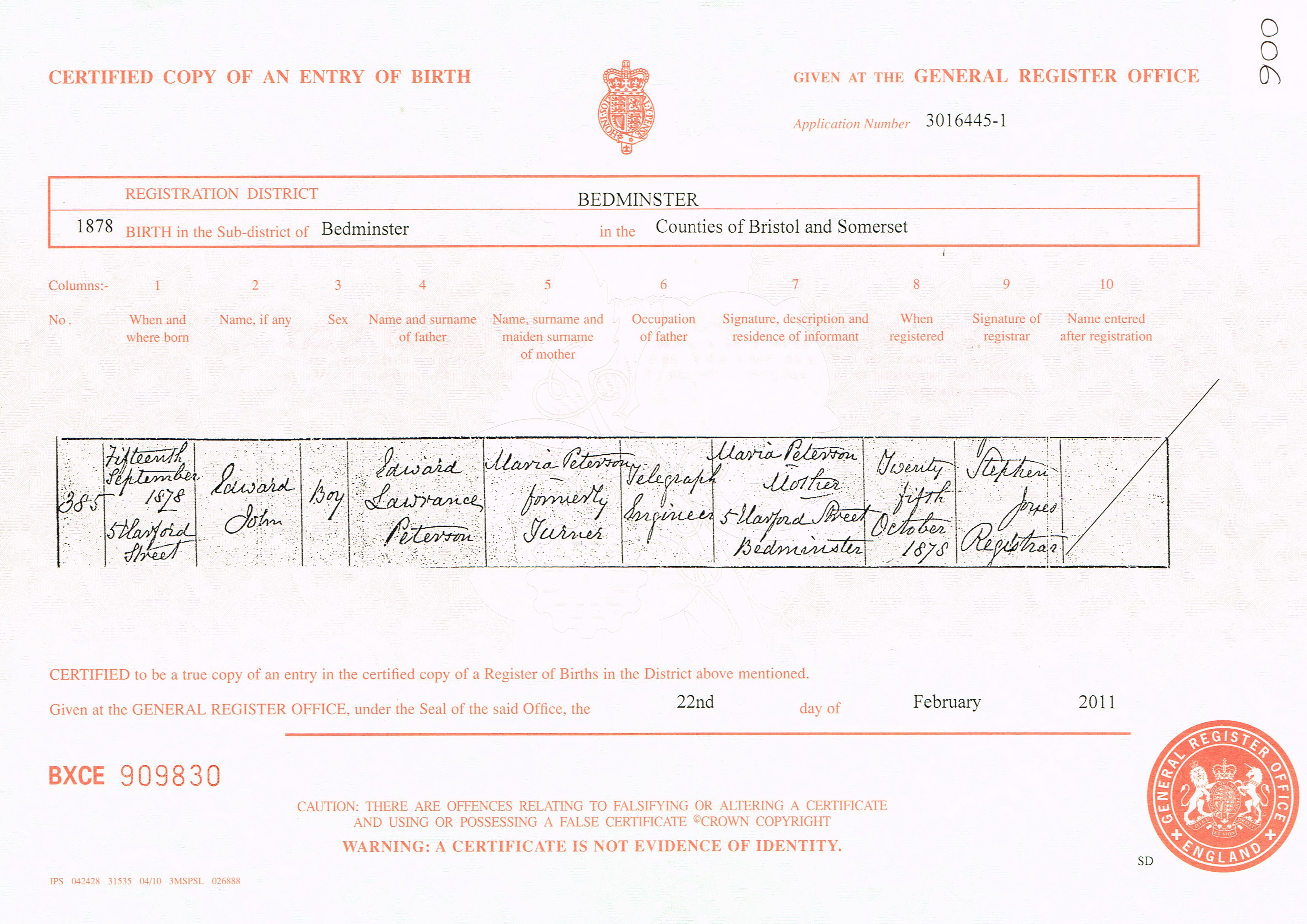 By 1901 the family had moved to London and Edward was then aged 22. In 1905 he married Alice Binning.