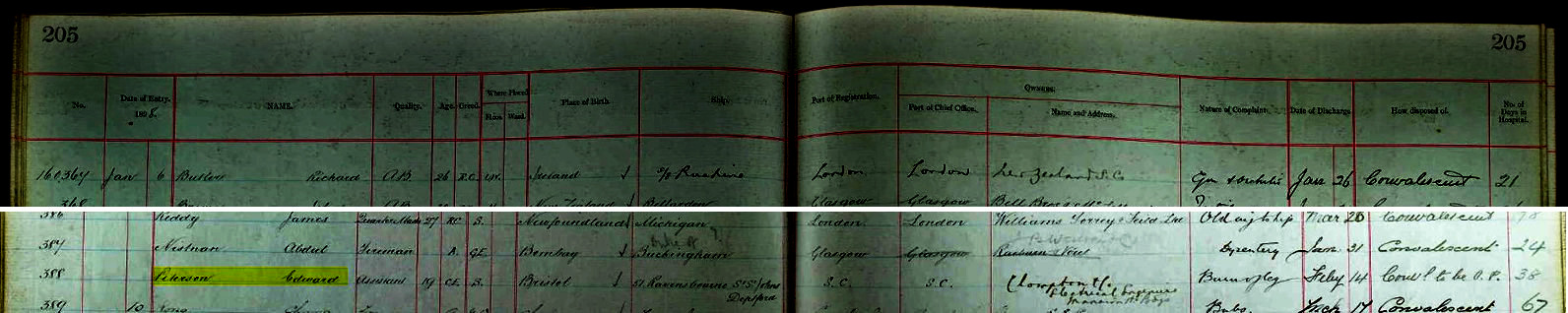 On January 8th 1897, aged 19, Edward is shown here Archive [1000] as having been admitted to Dreadnought Seamans Hospital. Seems he suffered from "burn of leg". He stayed for 38 days. Discharge was February 14th