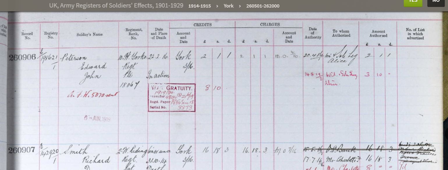 He is buried in Spoilbank Cemetery Belgium After his death all his medals went to Uncle John and when he died, we think Auntie Pat gave them away.He was awarded a War Gratuity. See here what this means, and below for the image of his entry in the Soldiers Effects Register