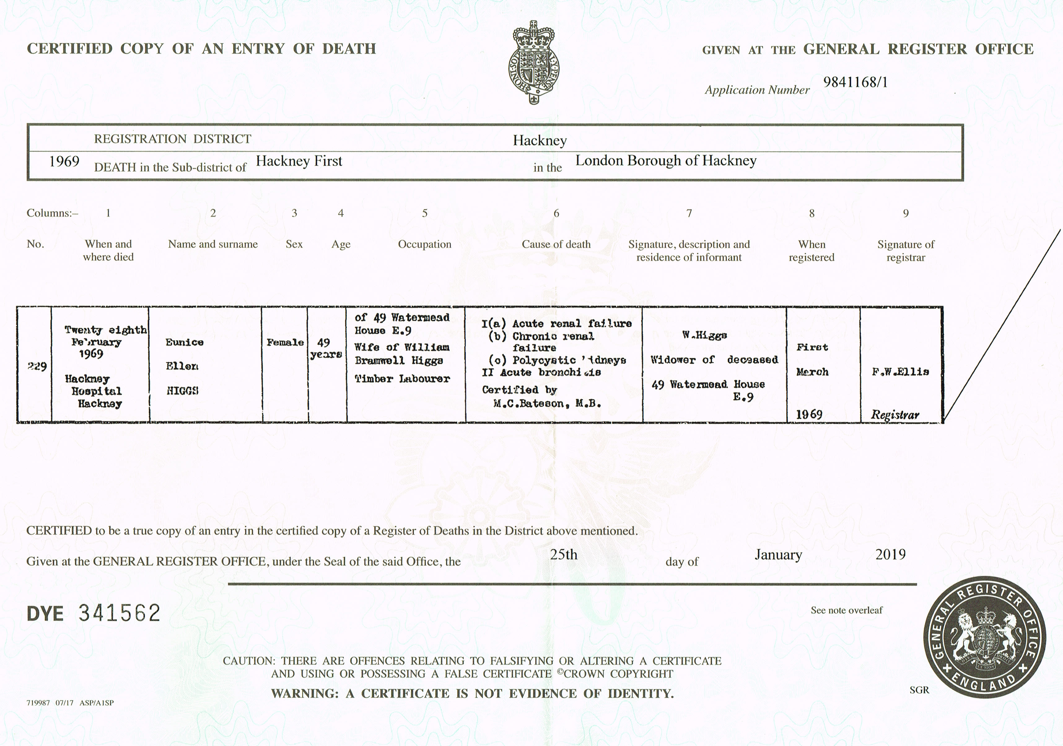 The 1939 Register below shows Eunice as a 19yr old single girl living at 13 Lambs Conduit Street. Her occupation is shown as general hand (Steward Station).